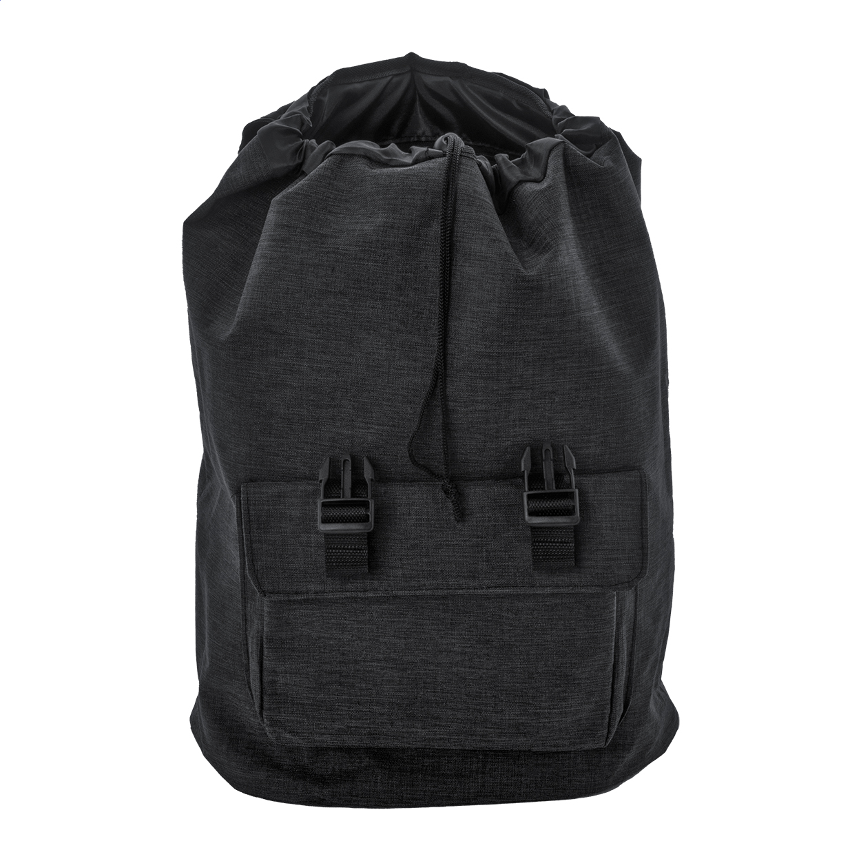 Zaino in poliestere 600D RPET con chiusura a coulisse e fibbia, tasca frontale in velcro, scomparto per laptop (15"), schienale e spallacci imbottiti ed etichetta RPET.