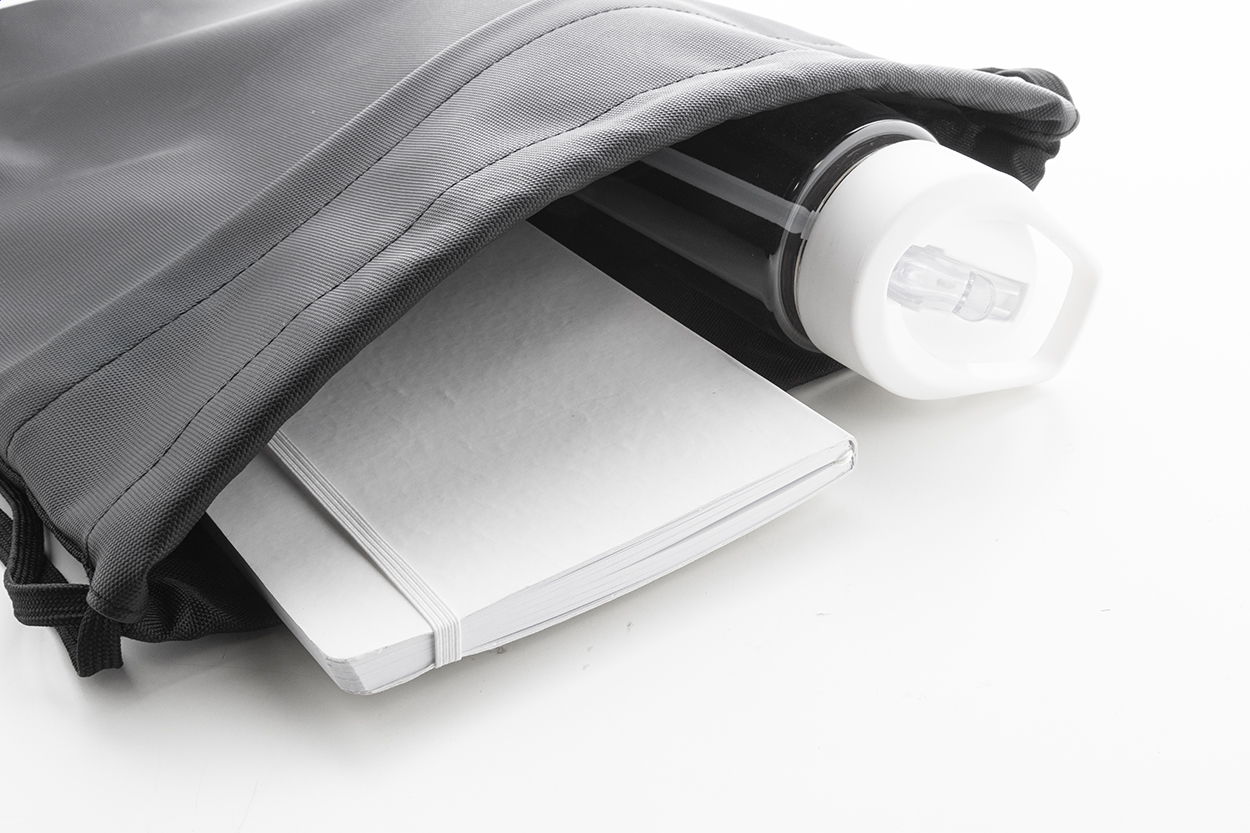 Sacca con chiusura a coulisse in poliestere 600D RPET con rivestimento in PU sul lato anteriore, tasca frontale con cerniera. ed etichetta RPET.