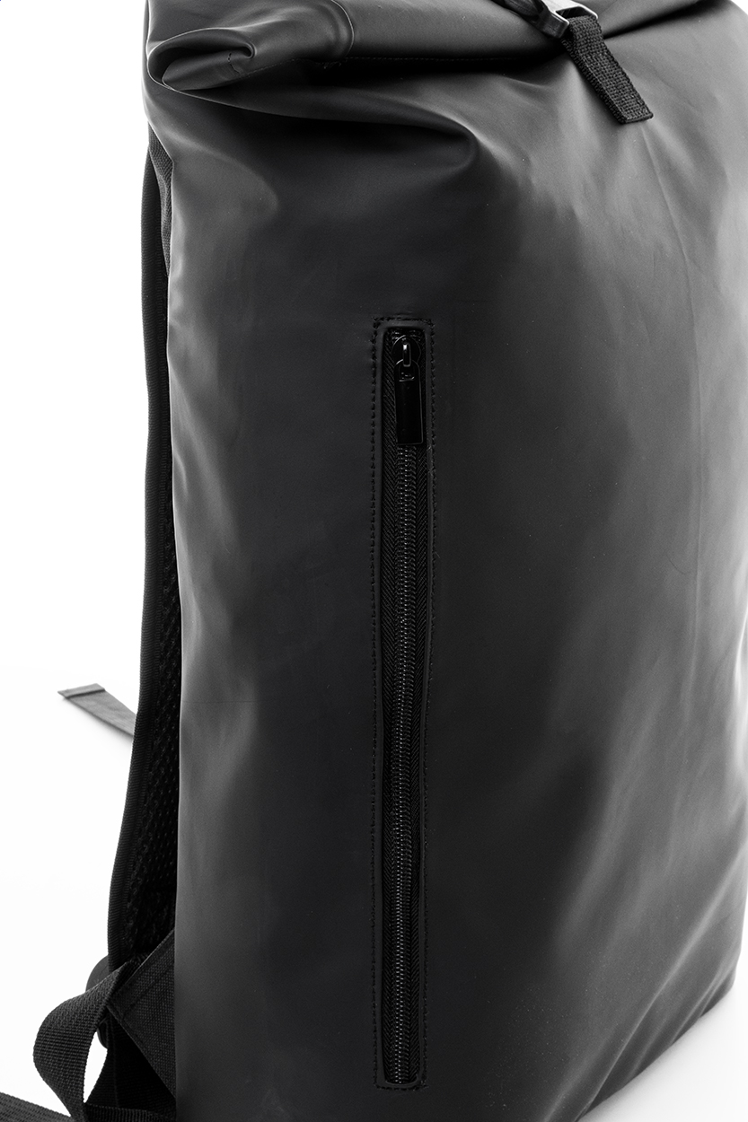 Zaino rolltop impermeabile in morbida pelle PU riciclata con chiusura a fibbia, tasca frontale con cerniera, scomparto imbottito per laptop (15"), schienale e spallacci imbottiti ed etichetta PU riciclato.