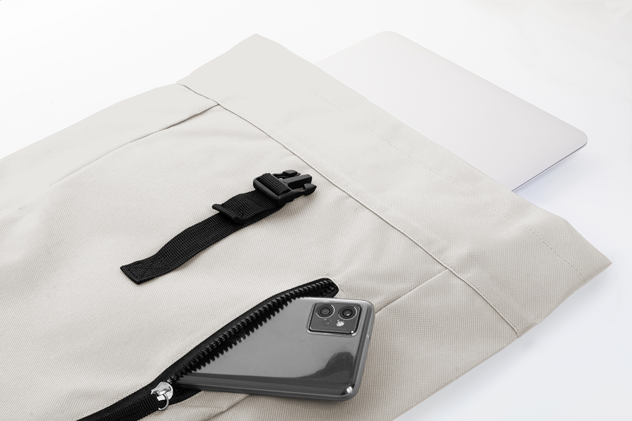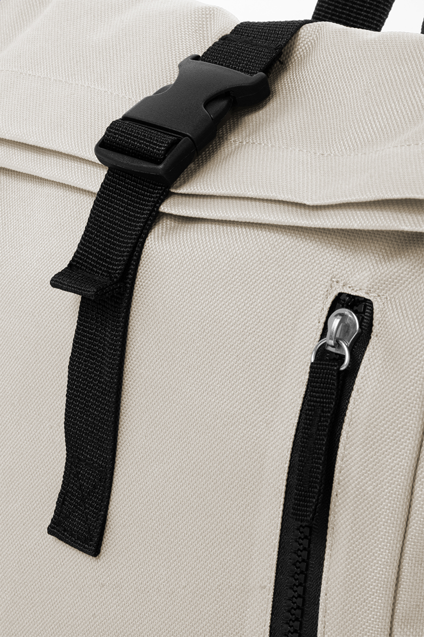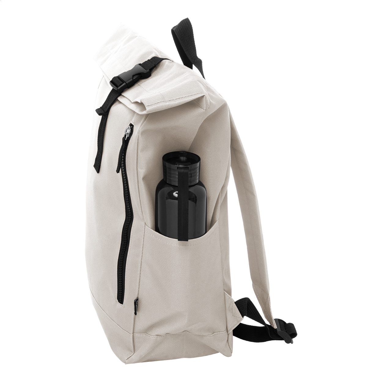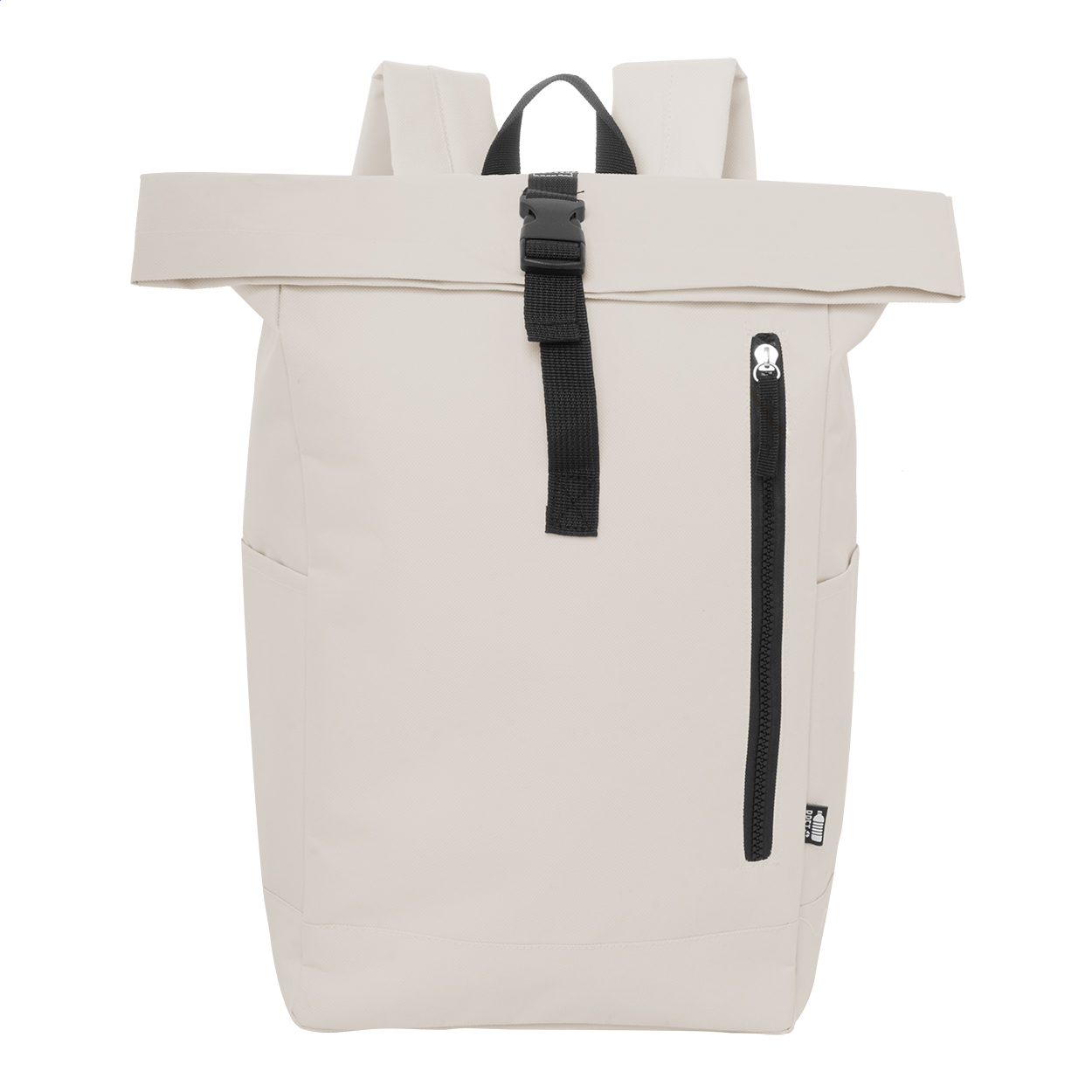 Zaino rolltop in poliestere 600D RPET con chiusura a fibbia, scomparto per laptop (14"), tasca frontale con zip, schienale e spallacci imbottiti. Etichetta RPET.