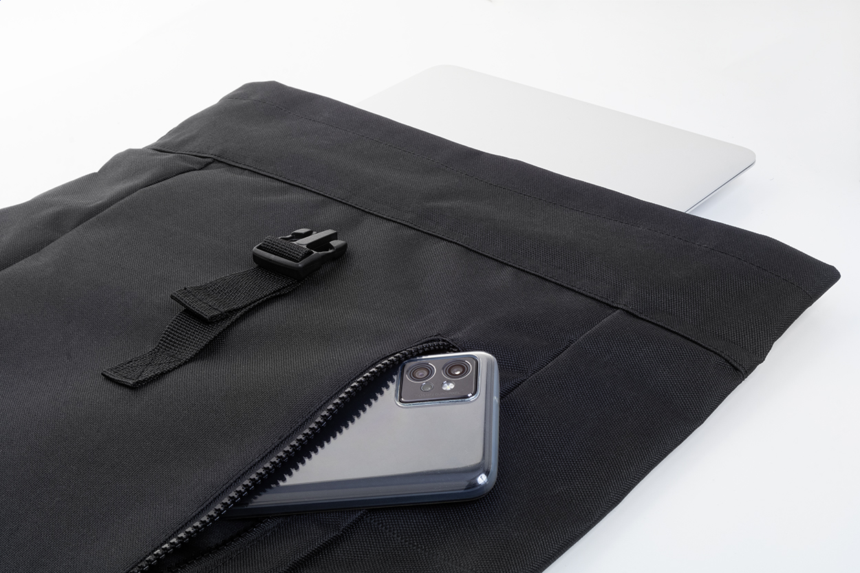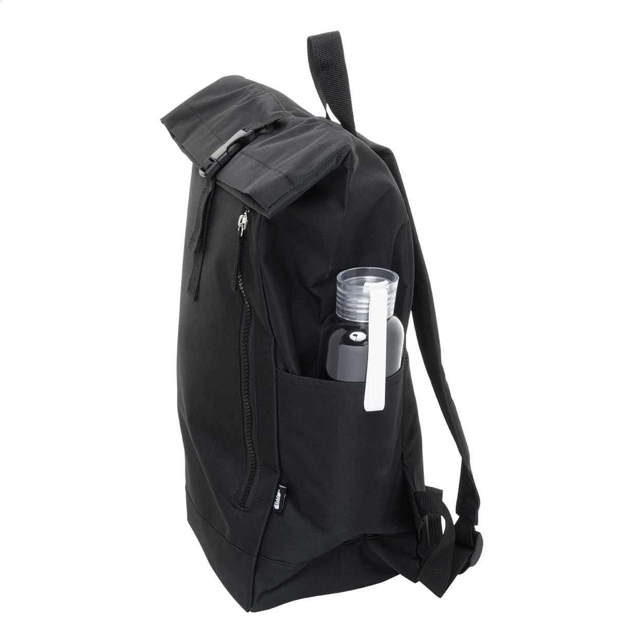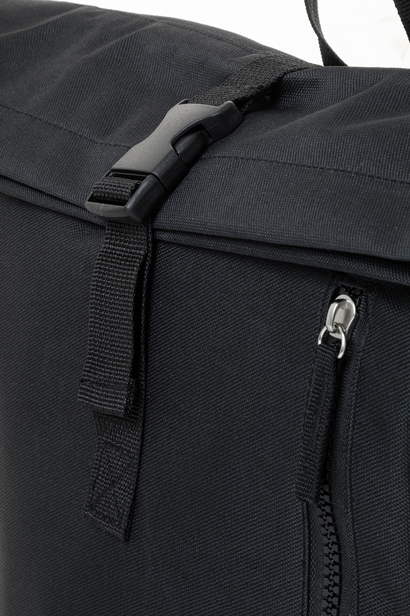 Zaino rolltop in poliestere 600D RPET con chiusura a fibbia, scomparto per laptop (14"), tasca frontale con zip, schienale e spallacci imbottiti. Etichetta RPET.