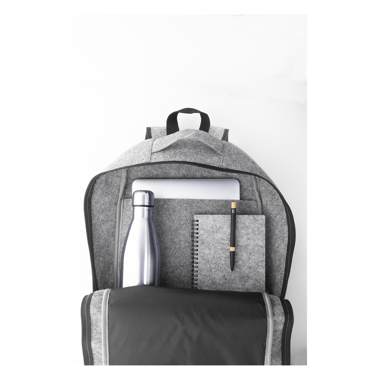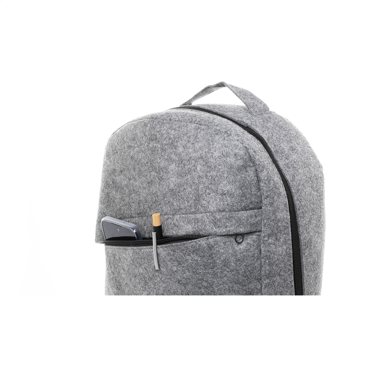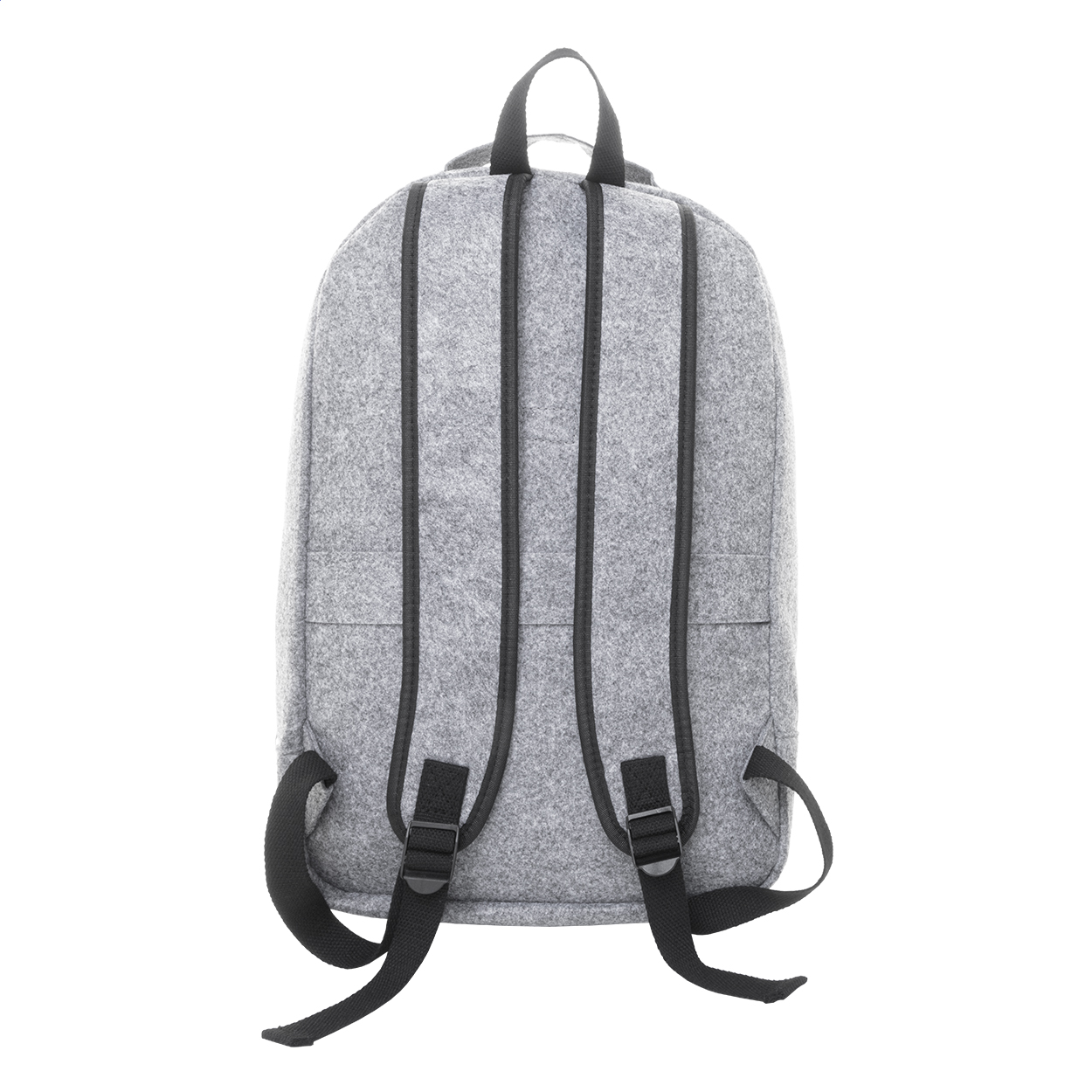 Zaino in feltro RPET con scomparto principale chiuso da cerniera e tasca frontale. Con scomparto per laptop (15"), tracolla, spallacci imbottiti ed etichetta RPET.