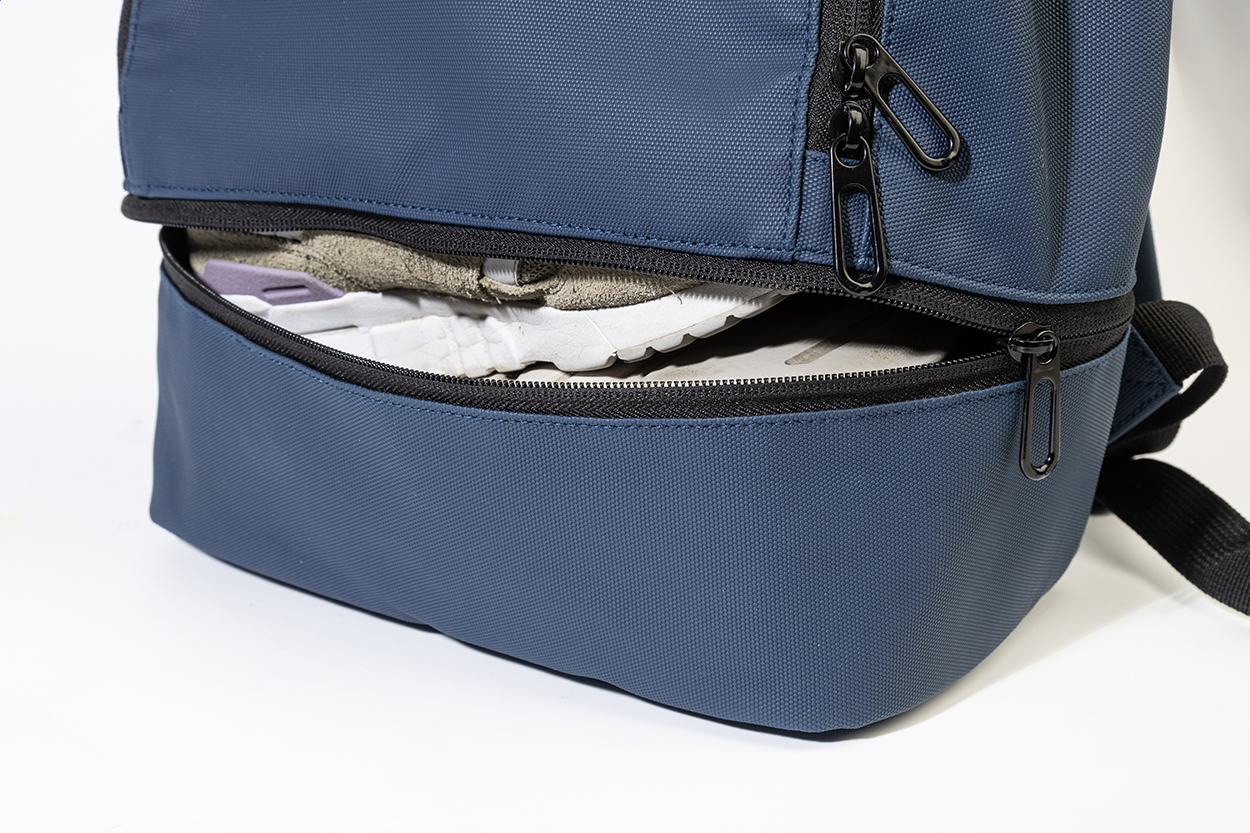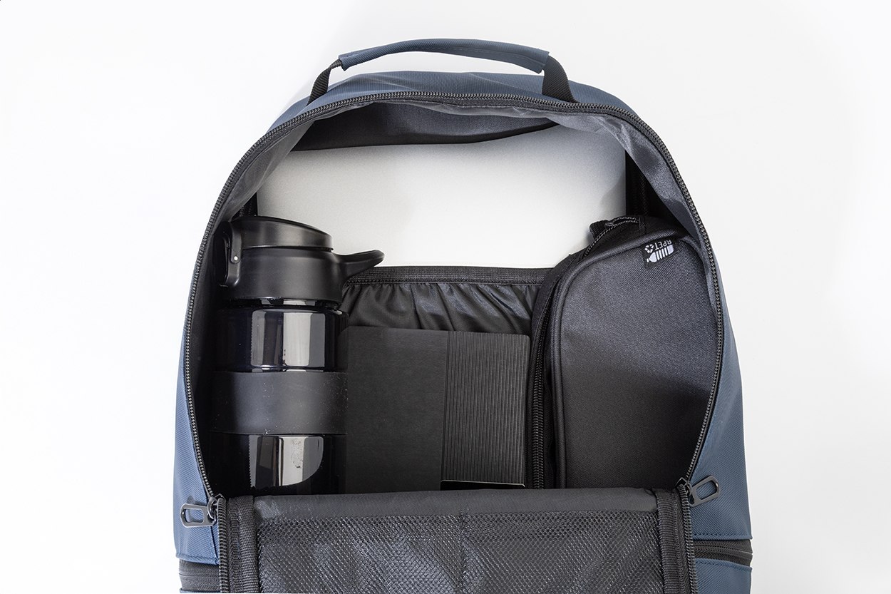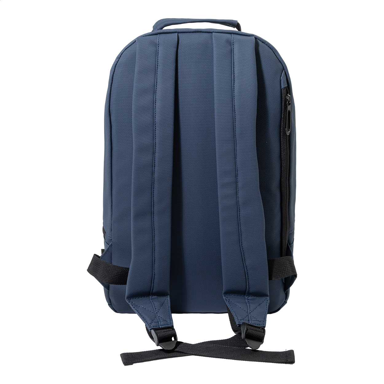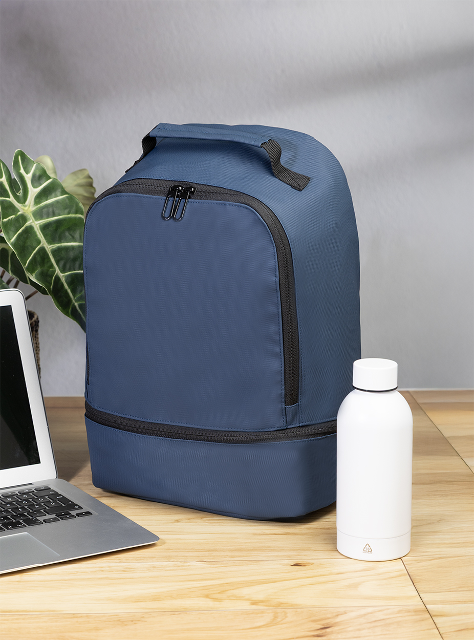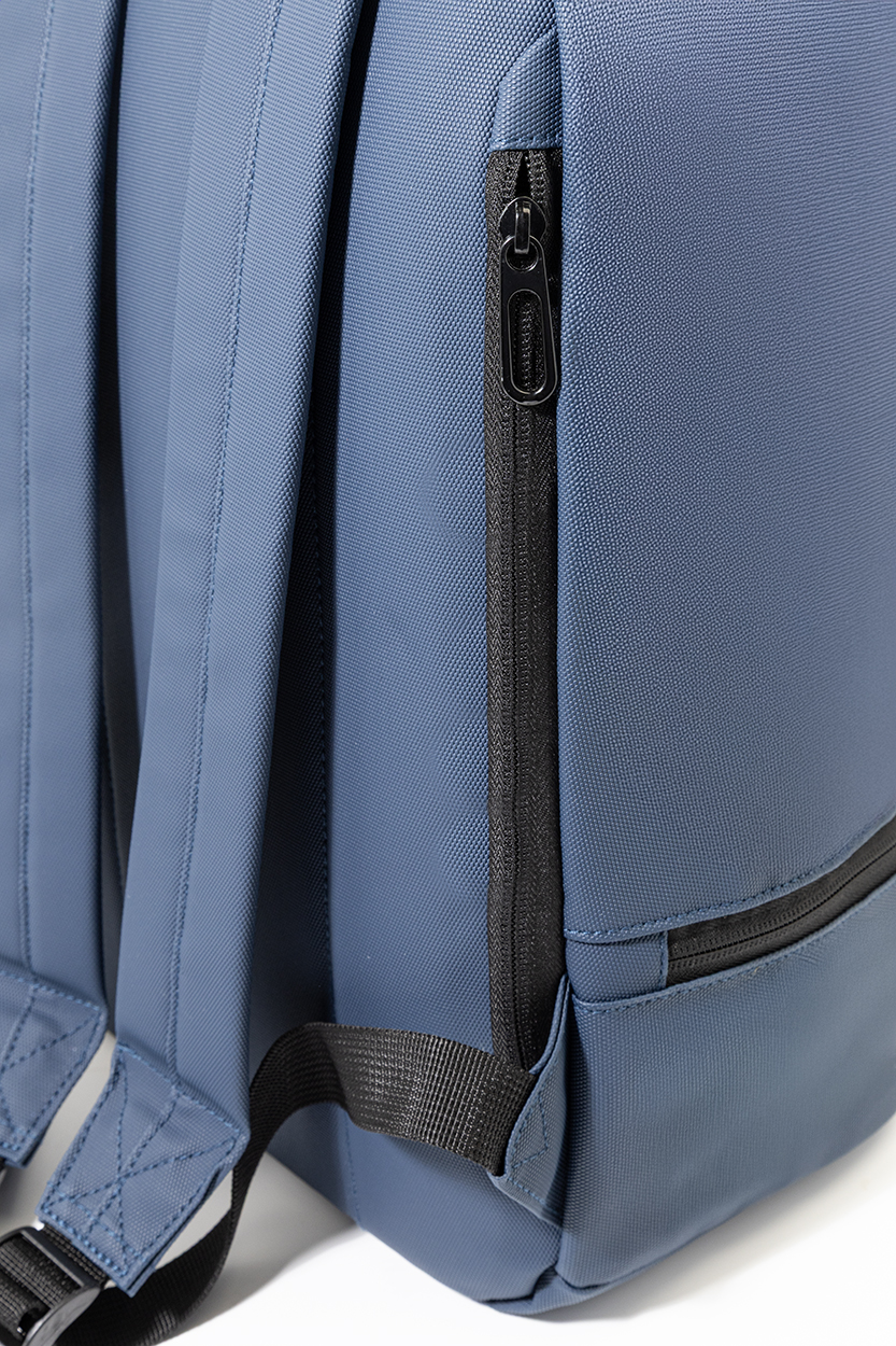 Zaino impermeabile in poliestere 600D RPET con scomparto principale chiuso da cerniera, tasca imbottita per laptop (13"), schienale e spallacci imbottiti, vano inferiore chiuso da cerniera, tasca laterale nascosta ed etichetta RPET.
