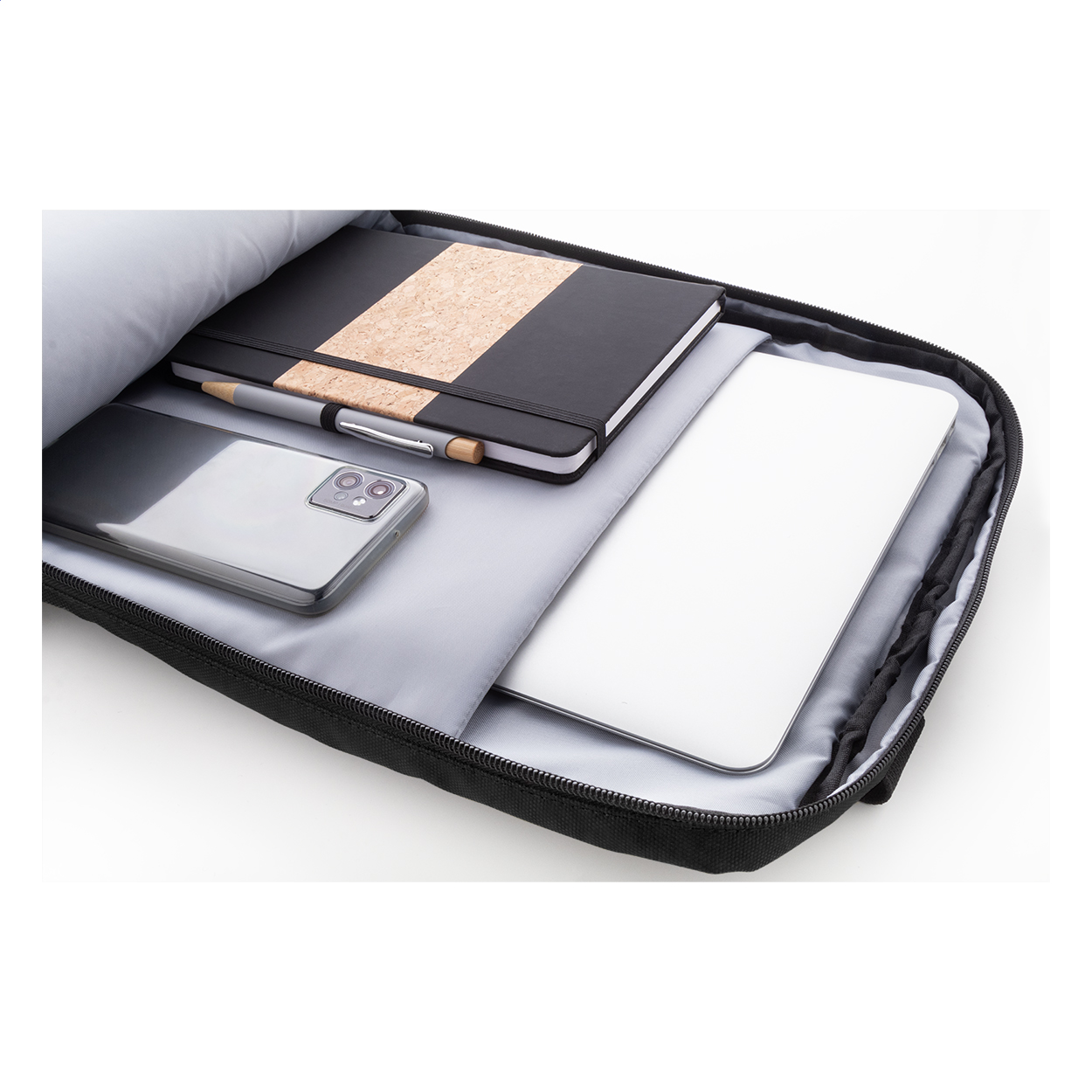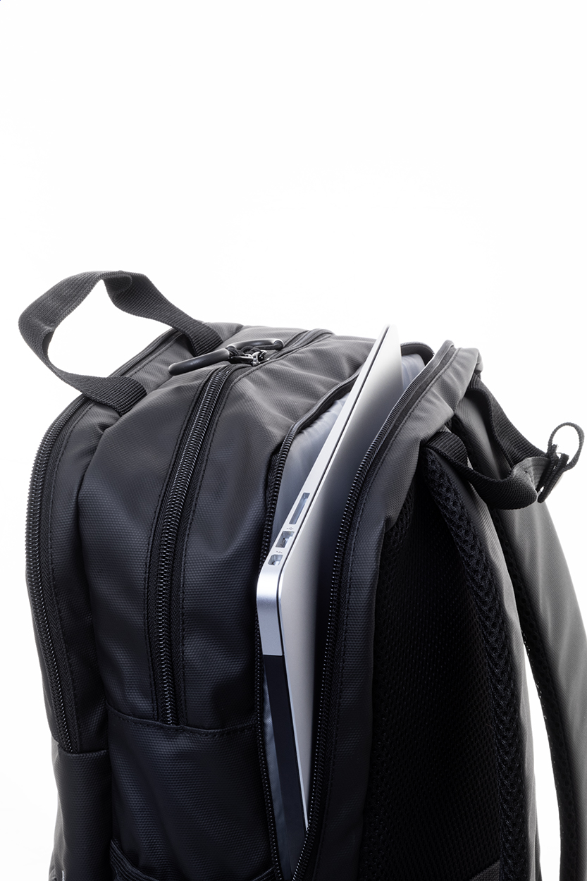 Zaino impermeabile in poliestere 600D RPET rivestito in PU, con 2 scomparti e 2 tasche anteriori chiusi da cerniera, tasche laterali, scomparto imbottito per laptop (16"), cinghia trolley, schienale e spallacci imbottiti. Etichetta RPET.