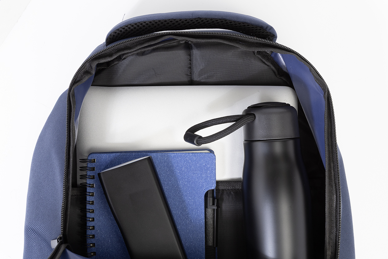 Zaino sportivo in poliestere 600D RPET con scomparti chiusi da cerniera, tasca frontale, scomparto imbottito per laptop (15"), schienale e spallacci imbottiti, tasche laterali in rete cordini elastici sul fronte ed etichetta RPET.