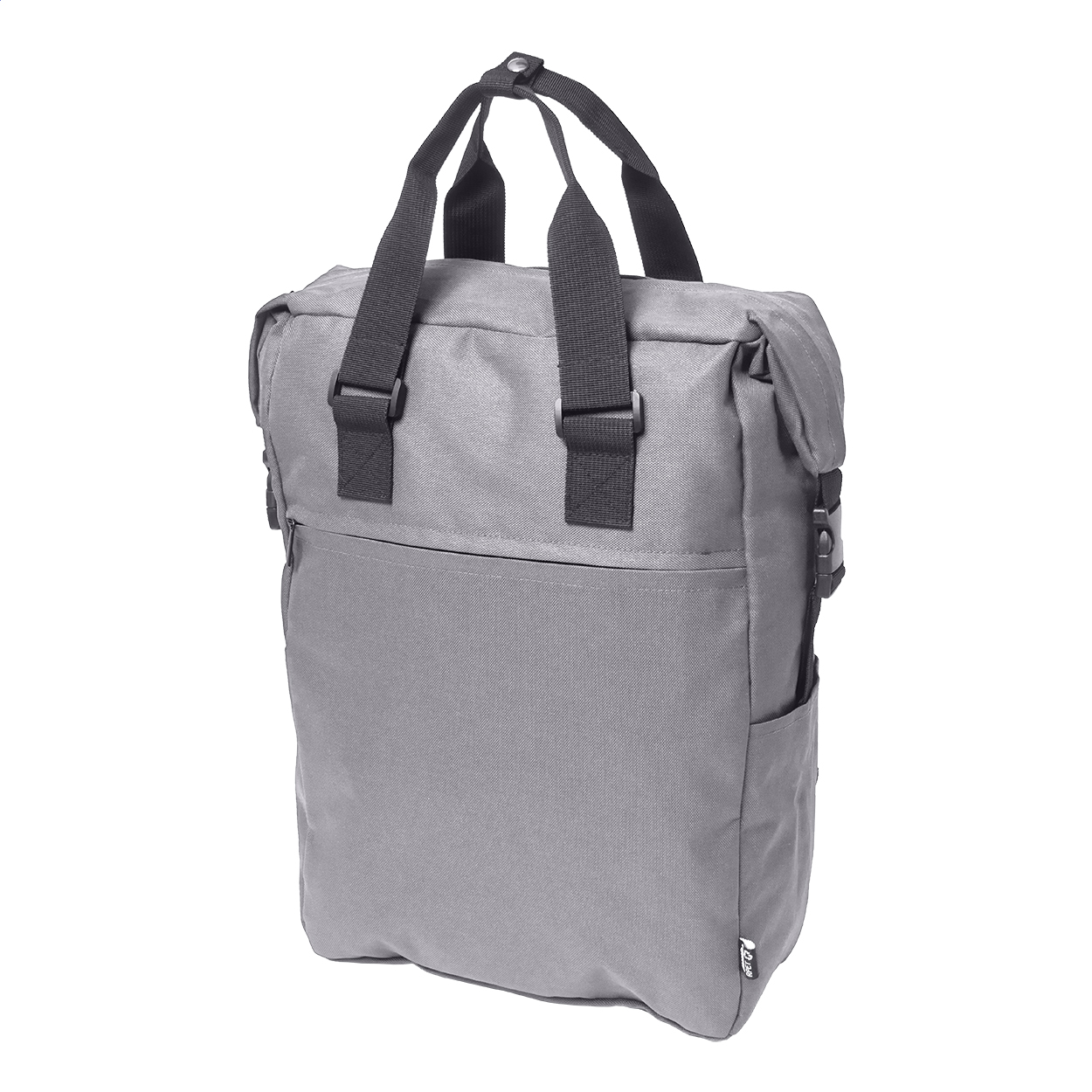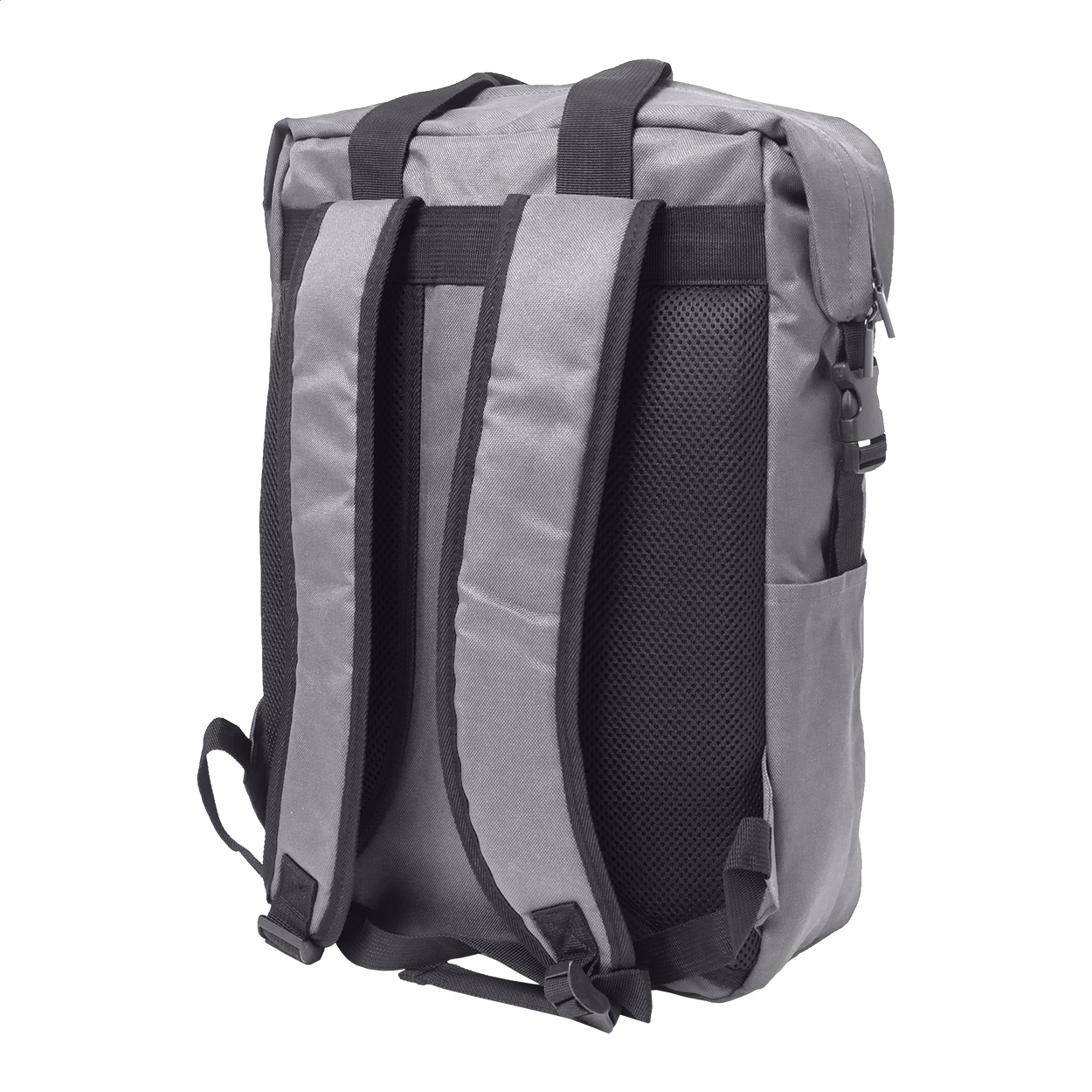 Zaino in RPET con scomparto principale e tasca frontale con zip, scomparto imbottito per laptop (15") e tablet (10"), cinghie laterali con fibbia e tasche, schienale e spallacci imbottiti. Poliestere 600D RPET con etichetta RPET.