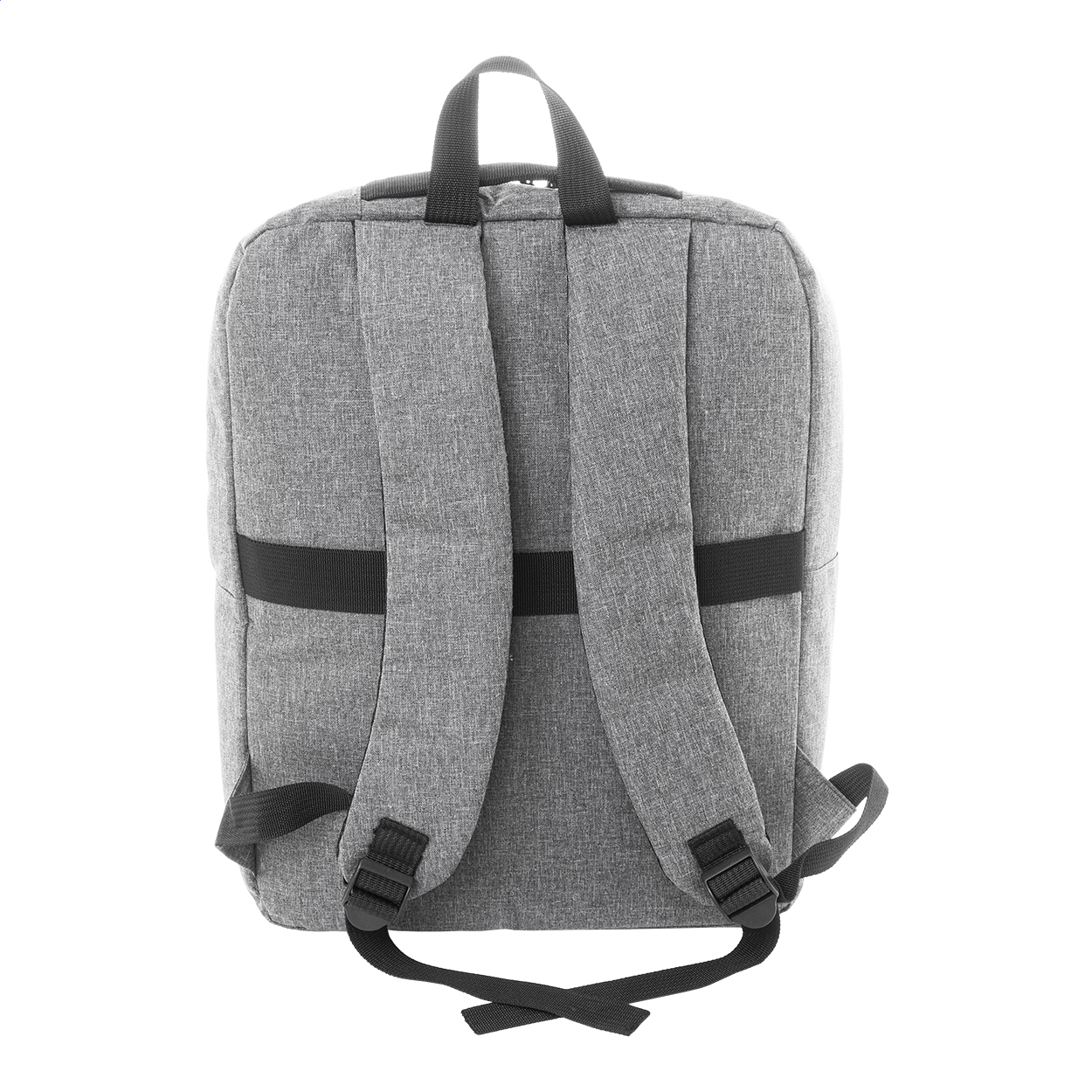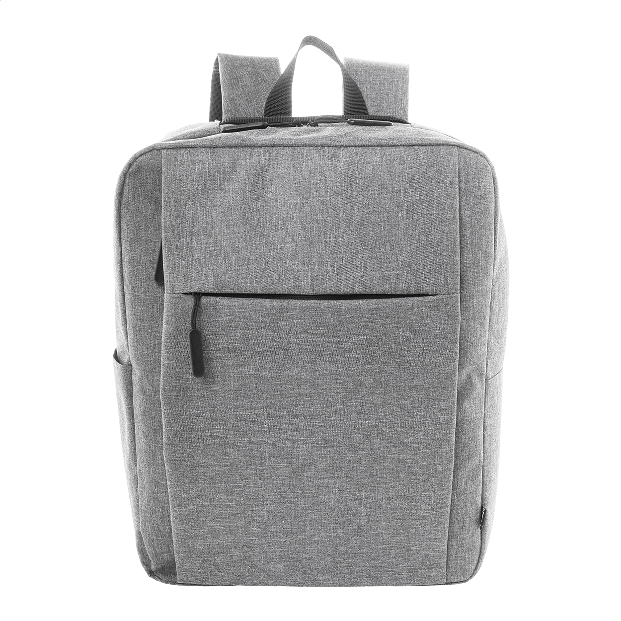 Zaino in poliestere 600D RPET con scomparto principale e 2 tasche chiusi da cerniera, tasca laterale, scomparto imbottito per laptop (15"), cinghia trolley, schienale e spallacci imbottiti ed etichetta RPET.