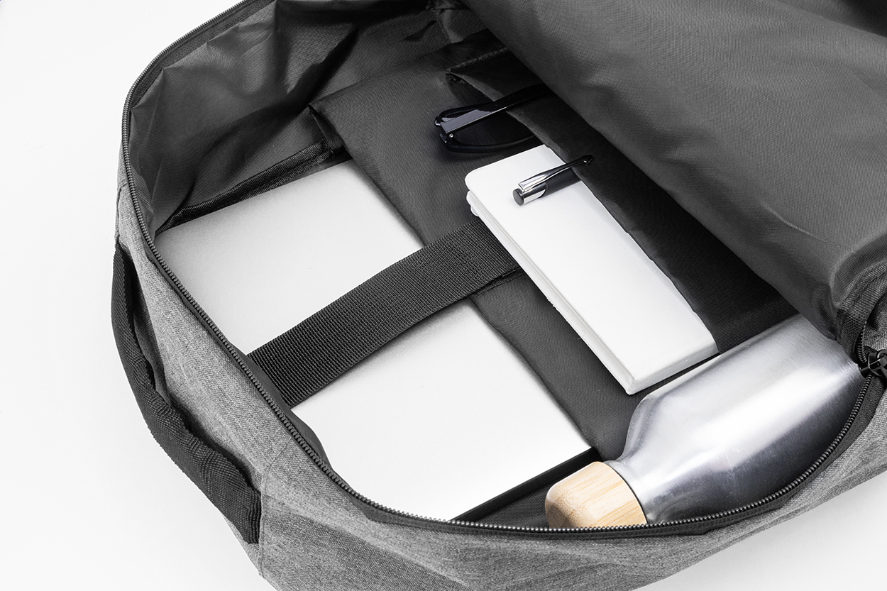 Zaino in poliestere 600D RPET con scomparto principale e 3 tasche anteriori tutte chiuse da cerniera Offre anche scomparti imbottiti per tablet (10“) e laptop (15”), schienale e spallacci imbottiti ed etichetta RPET.