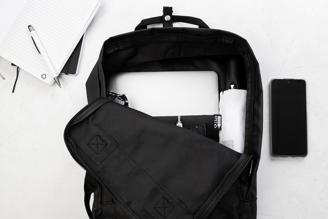 Zaino impermeabile in RPET con scomparto principale con cerniera, 2 tasche anteriori con cerniera, tasche laterali e scomparto imbottito per laptop (15") e tablet (10"). Con schienale e spallacci imbottiti. Poliestere 600D RPET rivestito in PU, con etiche