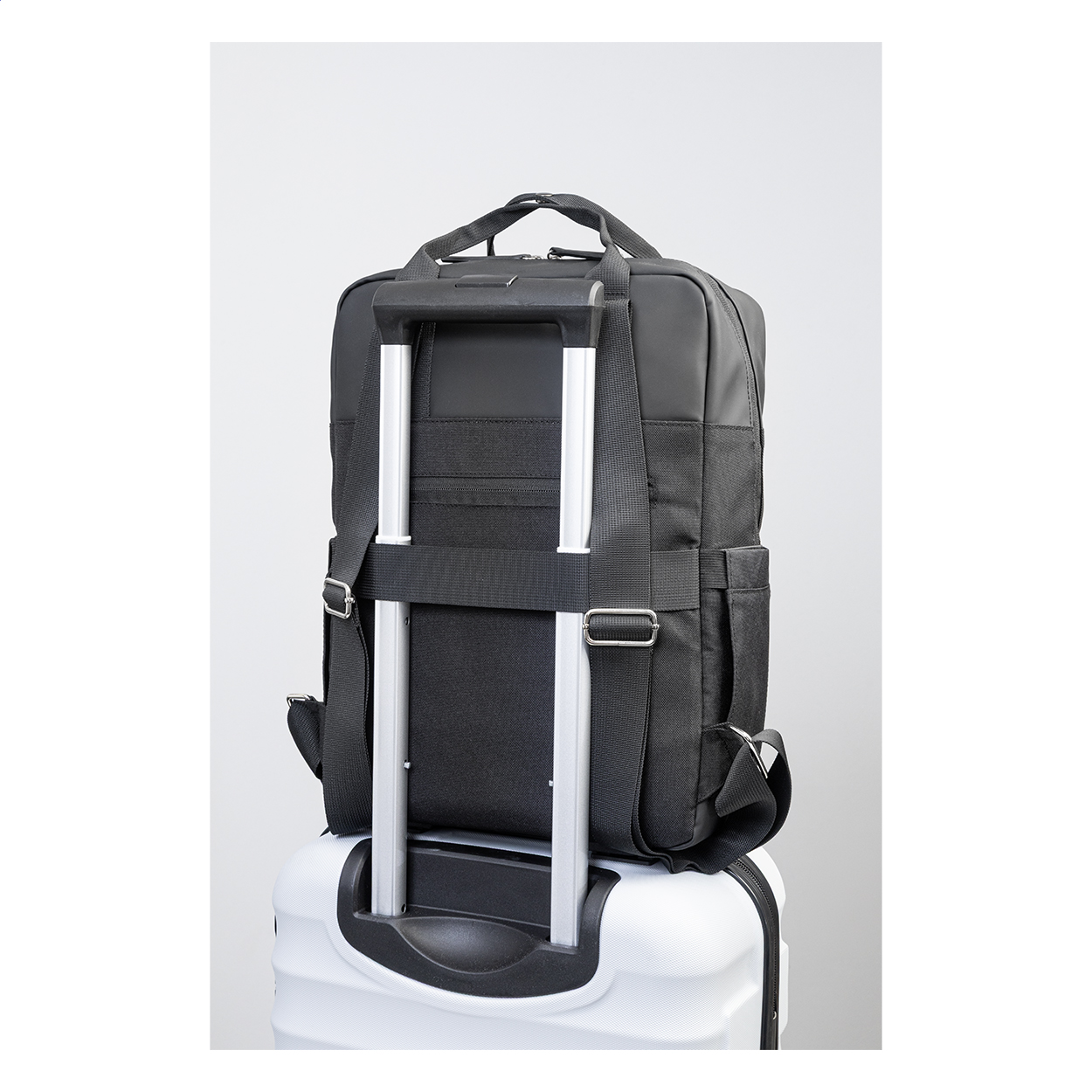 Zaino in poliestere 900D RPET con parte superiore in morbida pelle PU, scomparto e tasca anteriore chiusi da cerniera, tasche laterali, tasca antifurto, cinghia per trolley, schienale imbottito, scomparto per laptop (15") ed etichetta RPET. Confezione con sacchetto antipolvere in tessuto non tessuto RPET.
