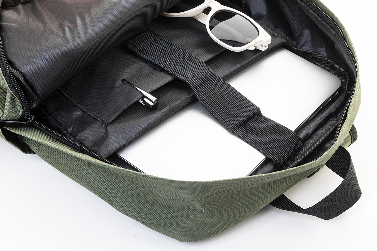 Zaino in poliestere 600D RPET con scomparto principale e 2 tasche chiusi da cerniera, tasca laterale, scomparto imbottito per laptop (15") e tablet (10"), cinghia trolley, schienale e spallacci imbottiti ed etichetta RPET.