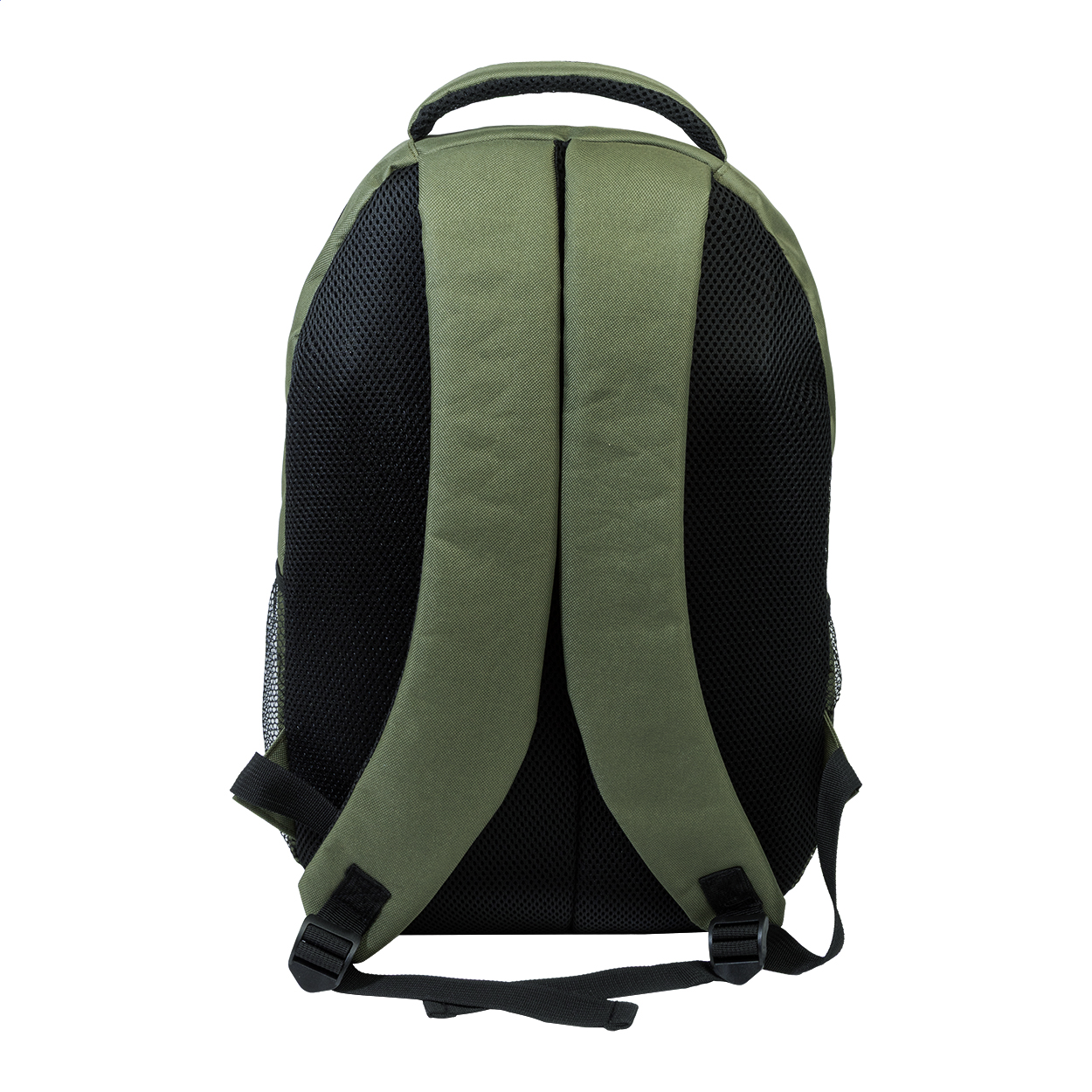 Zaino sportivo in poliestere 600D RPET con scomparti chiusi da cerniera, tasca frontale, scomparto imbottito per laptop (15"), schienale e spallacci imbottiti, tasche laterali in rete cordini elastici sul fronte ed etichetta RPET.