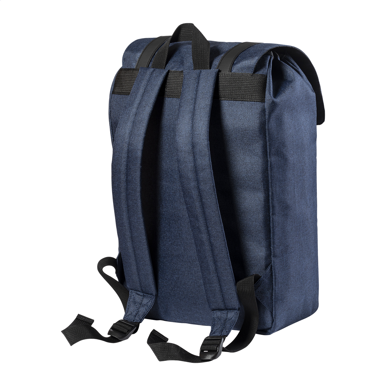 Zaino in RPET con scomparto imbottito per laptop (15") e tablet (12"), tasca frontale con zip, schienale e spallacci imbottiti. Scomparto principale con chiusura a coulisse e bottone magnetico. Poliestere 300D RPET. Con etichetta RPET.