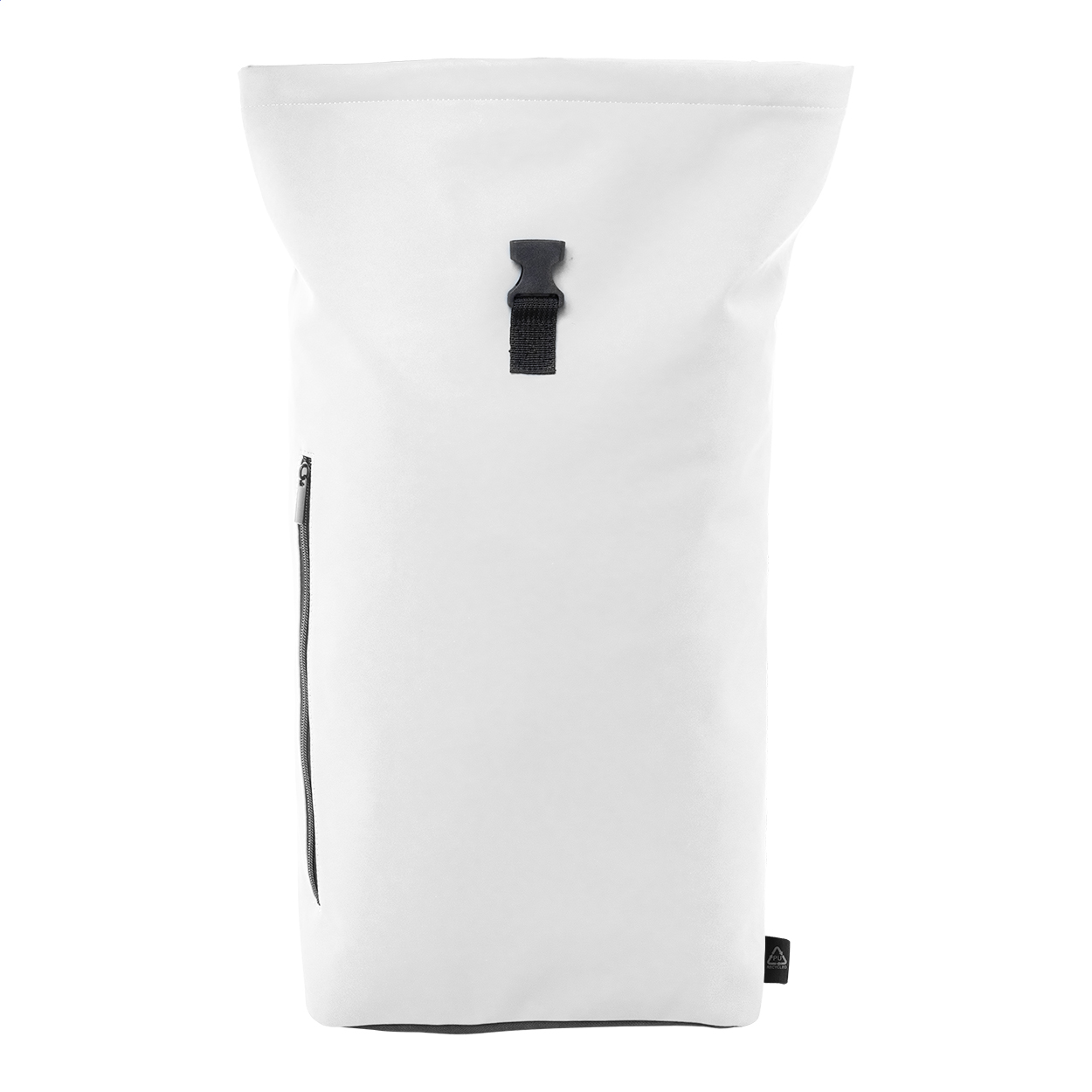 Zaino rolltop impermeabile in morbida pelle PU riciclata con chiusura a fibbia, tasca frontale con cerniera, scomparto imbottito per laptop (15"), schienale e spallacci imbottiti ed etichetta PU riciclato.