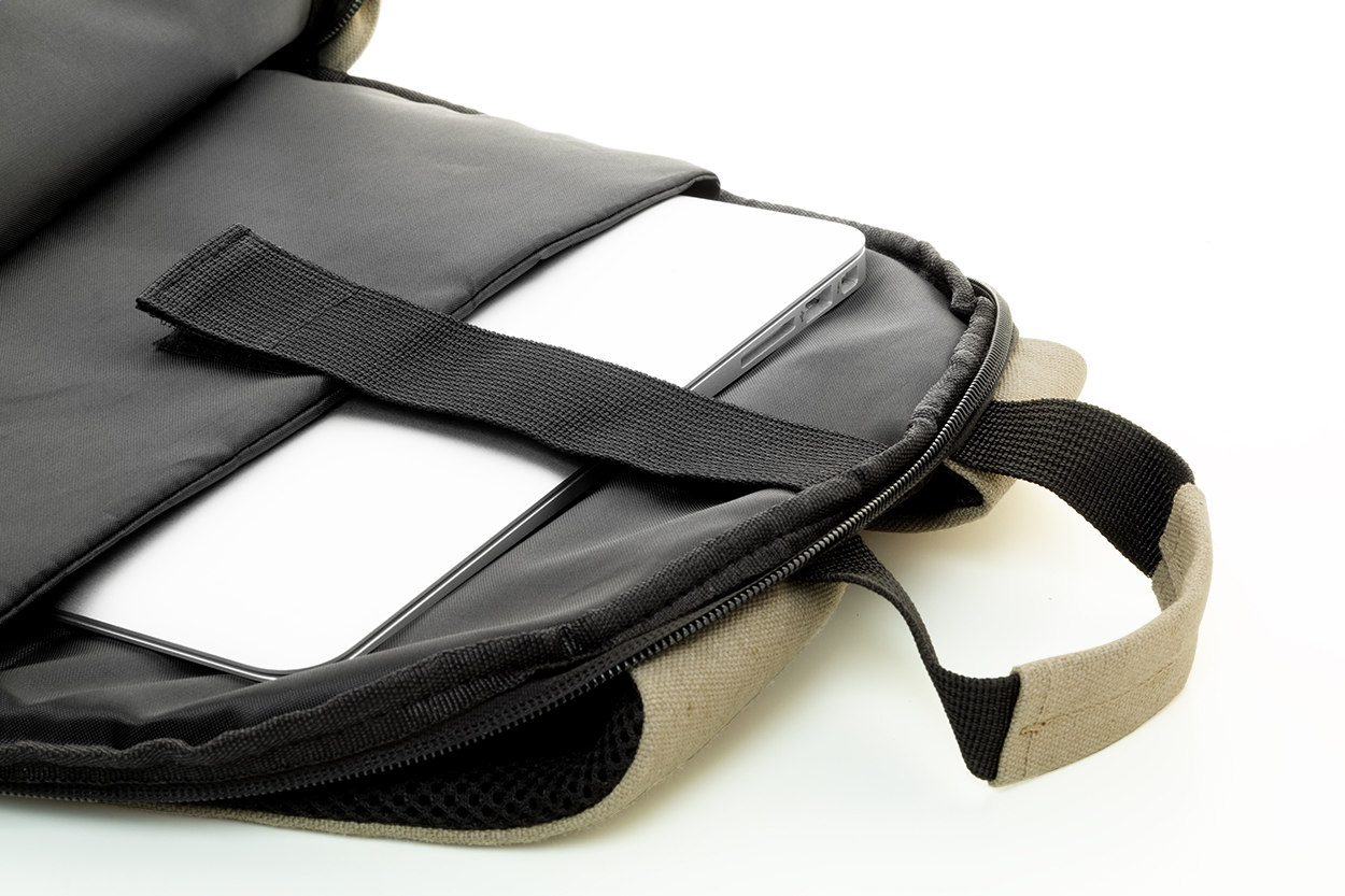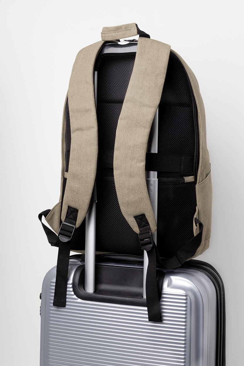 Zaino in tela riciclata con scomparto principale e tasca frontale chiusi da cerniera, scomparto imbottito per computer portatile (15"), tasche laterali, cinghia per trolley, schienale e spallacci imbottiti e tasca antifurto nascosta. 70% cotone riciclato e 30% poliestere RPET. Etichetta cotone riciclato.